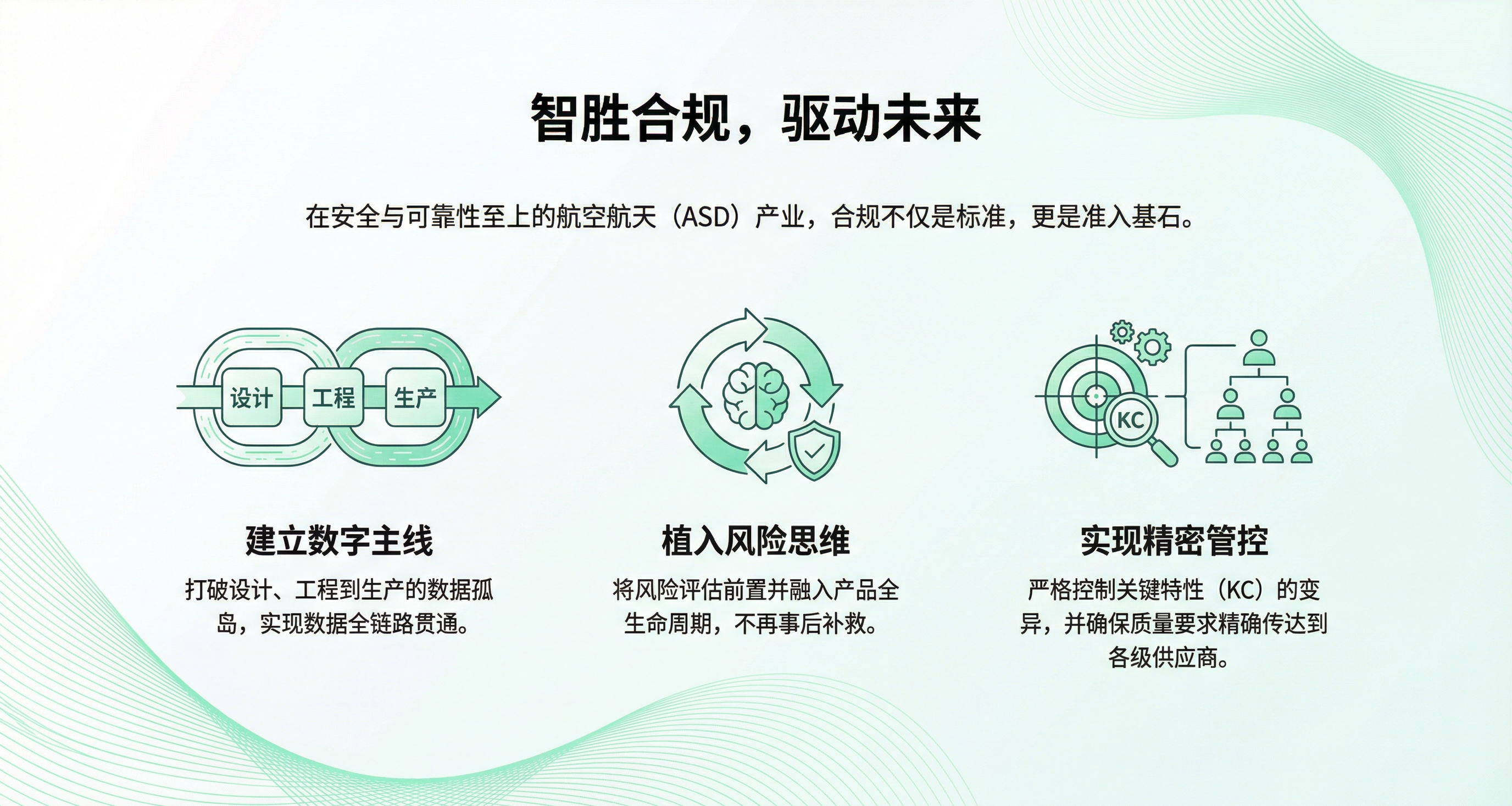 在极度强调安全与可靠性的 ASD 产业,合规不仅是标准,更是准入基石。我们提供数字化解决方案,协助企业应对 ISO 9001:2015 叠加航天特殊要求 的复杂挑战,将合规转化为竞争优势。